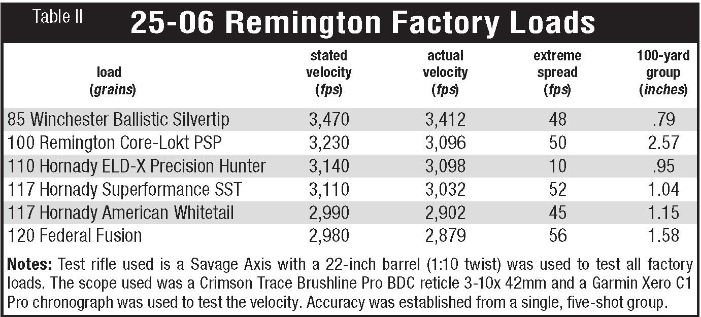 The second offering tested was a 100-grain Remington Core-Lokt, which was the worst for the accuracy test, coming in at a 2.57-inch, five-shot group. Average velocity of 3,096 fps with SD 17 and ES 50. This was a bummer for me because I have used a lot of Core-Lokt on big game over the years, and the bullet performed well on game.