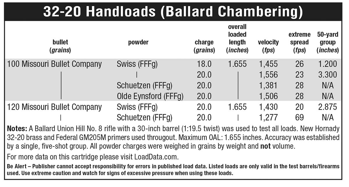 The accompanying table shows the loads tried and the results. Modern 32-20 brass will hold 20 grains of FFg or FFFg, but, depending on the brand, it fills the case to the brim or a bit beyond. This means it will be slightly compressed with a 100-grain bullet, and more with a 120-grain, to stay within the maximum cartridge length.