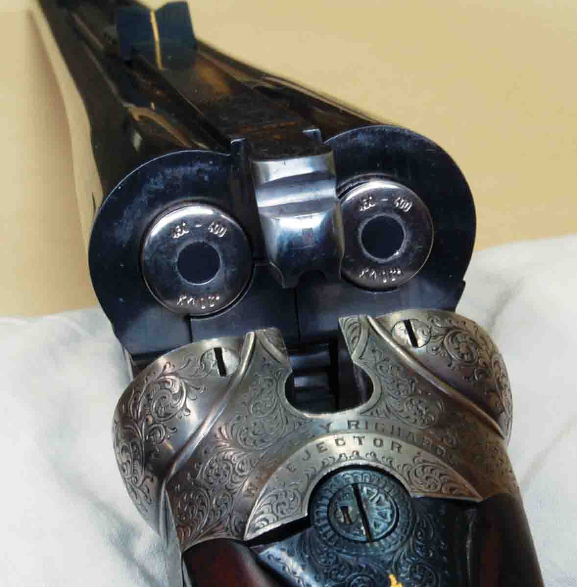 A most important use for snap caps, however, is double guns with a single trigger or automatic safety (safety is pushed “on” when top lever is moved to open the action). All doubles should have the locks in fired position when not being used, because many have V-springs powering the hammers, which often break if left under full compression. These can also break if the lock is fired on an empty chamber, as will firing pin tips. Unless snap caps are used there is no way to relieve mainsprings on these guns.