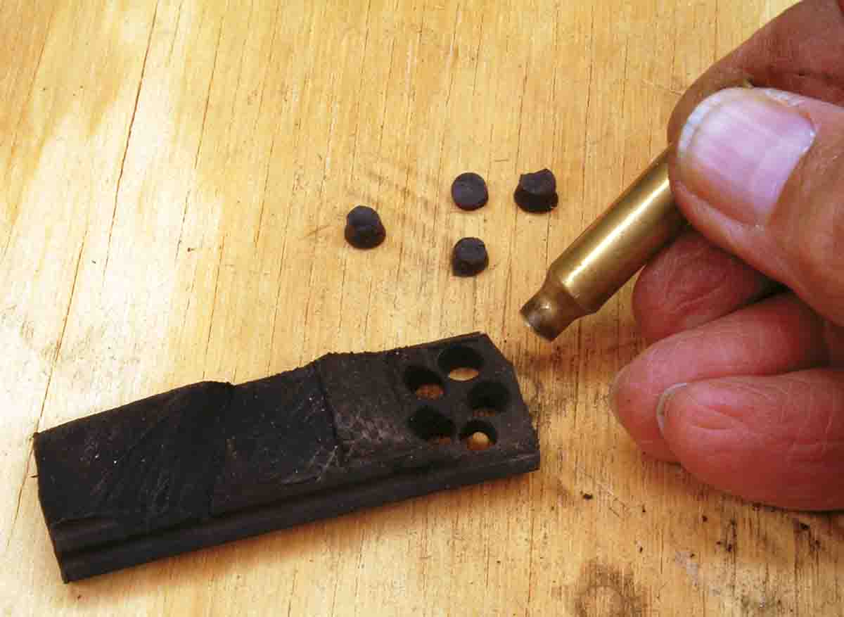 case that has had its mouth sharpened with a chamfering/deburring tool. Twisted in cookie cutter fashion, it cuts the tire material, producing a plug that snugly fits in large rifle primer pockets. Excess is sheared off using a sharp razor blade.