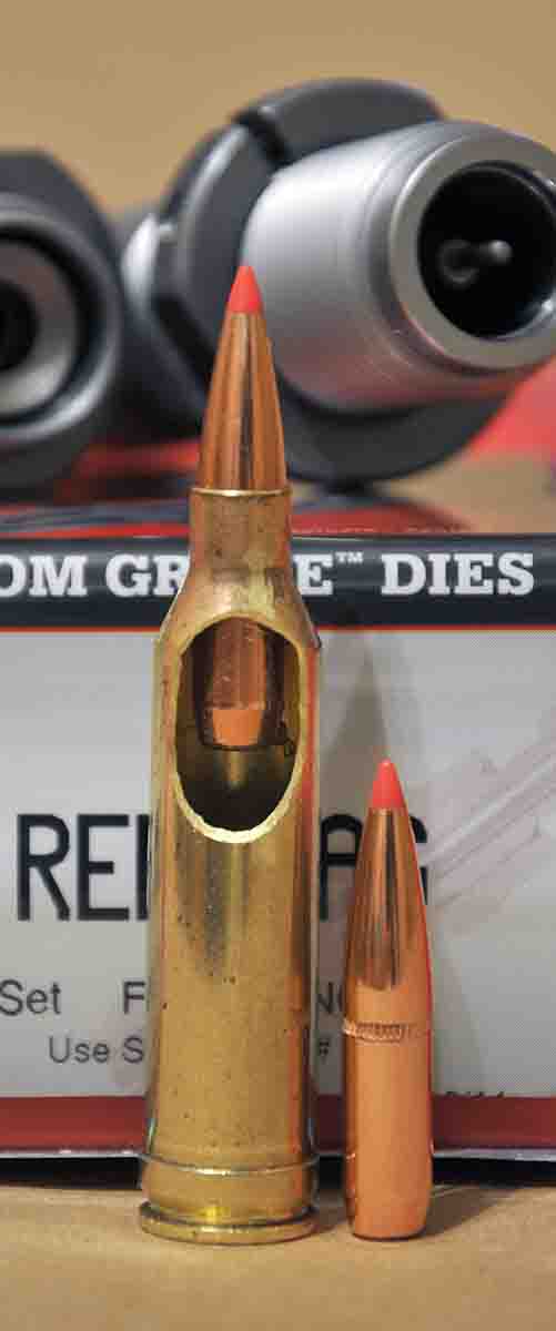 Cartridge overall length was kept to 2.797 inches, just shy of the standard maximum overall cartridge length of 2.80 inches, because the shorter length allowed a better fit in the magazine. Powder charges, a few of them compressed, ran from 58.5 to 62 grains; the latter proved I was pressing my luck with pressures as measured case head expansion and sticky bolt lift indicated. Sixty-one grains of RL-22 gave a chronographed velocity of 3,287 fps 10 feet in front of the muzzle, as well as consistent five-shot groups averaging one inch at 100 yards. Interestingly, this load also gave the highest extreme velocity spread, 34 fps, indicating the narrower extreme spreads provided by lesser and greater charges of the same powder did not amount to any accuracy gain for this particular rifle and load components.