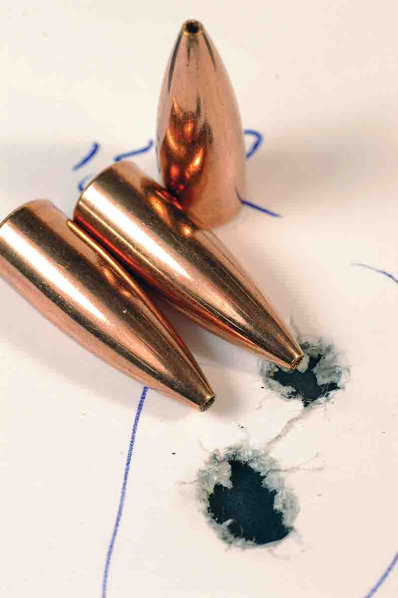 A gently recoiling practice load consisted of 45.0 grains of H-4895 paired with Speer 100-grain bullets. At first the load shot groups with a vertical spread, and that was expected due to extreme velocity spreads ranging from 70 to 90 fps. But groups tightened up quite a bit after a few trips to the range. Bullets from this load hit right on aim at 100 yards, with 150-grain bullets at full velocity hitting 2 inches above aim at that distance.