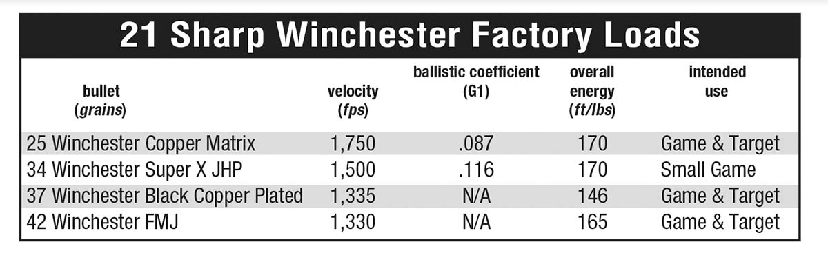 Consider as well that the 21 Sharp’s Copper Matrix bullet, being lead-free, is welcome for hunting where the 22 Long Rifle’s universally lead bullets are prohibited. Not designed to expand, the Copper Matrix bullet instead provides exceptionally deep penetration. Winchester’s 21 Sharp Super X 34-grain JHP bullet has demonstrated rapid and consistent expansion in ballistic gelatin, promising to be an excellent varminter.