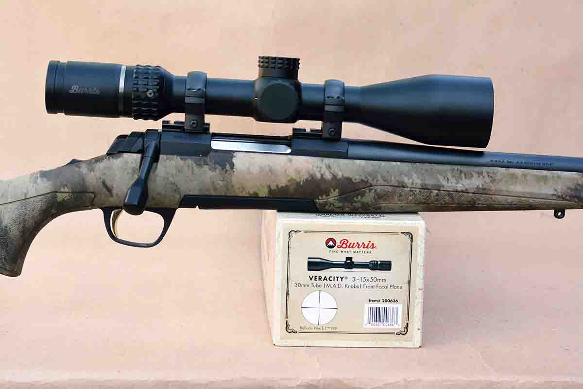 A Burris Veracity 3-15x 50mm riflescope with a 30mm maintube and featuring a front focal plane reticle, was mounted on the rifle. It has desirable features, including a fast focus eyepiece, side parallax adjustment, generous eye relief, click adjustments, great optical clarity and resolution and functioned flawlessly throughout testing.
